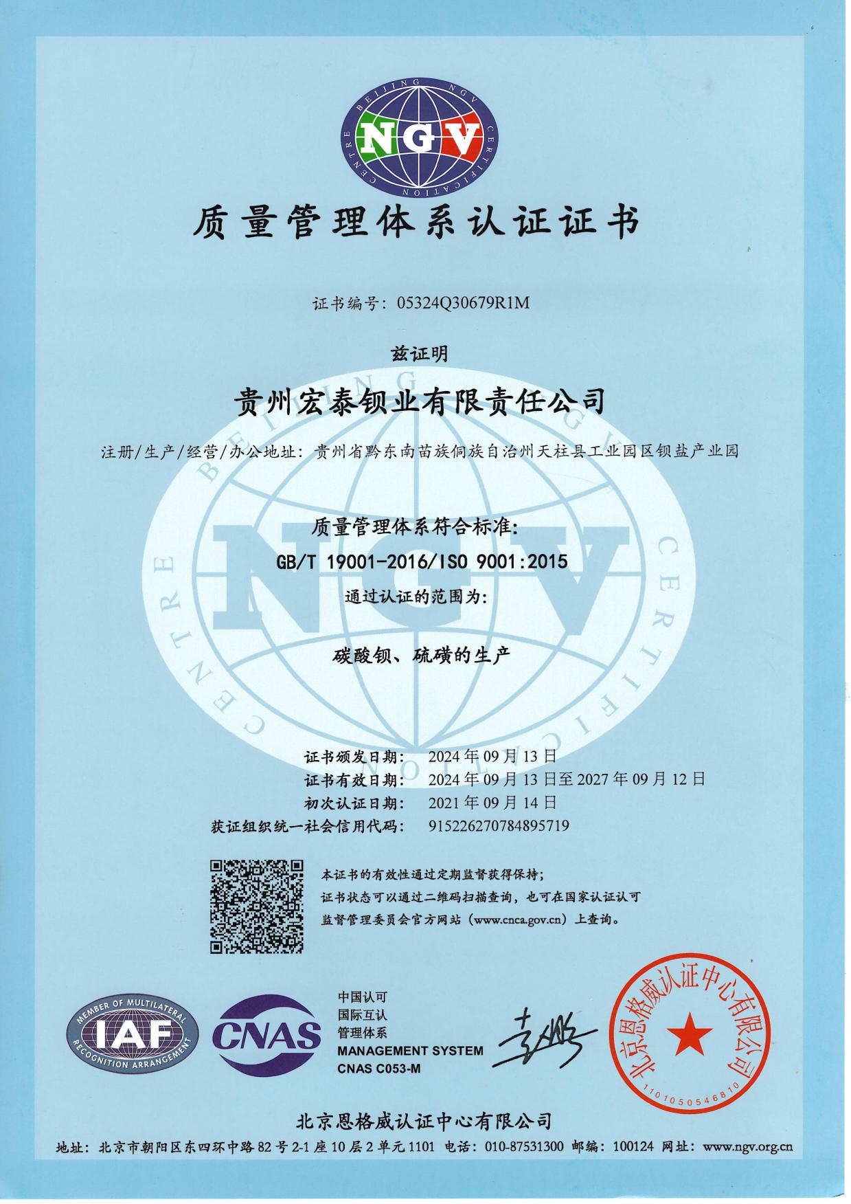 质量管理体系认证证书