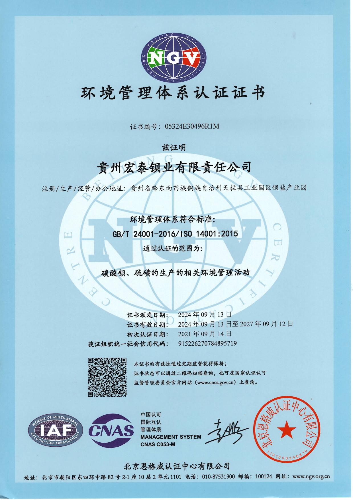 环境管理体系认证证书